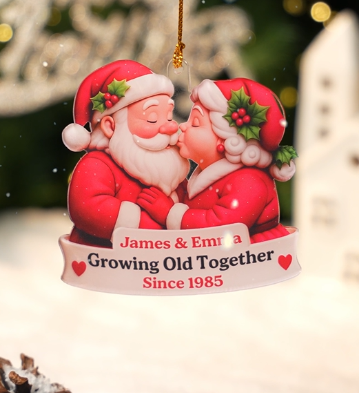 These personalized Christmas ornaments make the perfect addition to your festive décor or gift for your partner. Featuring a touching quote, “Growing Old Together Since…”, each ornament is customized with your names, year, and a Santa couple design to reflect your unique love story. Crafted with advanced 3D printing effects on high-quality acrylic, this ornament captures light beautifully on the tree. It’s one of the most heartfelt personalized couple gifts for Christmas, or even newlyweds celebrating their first holiday together.