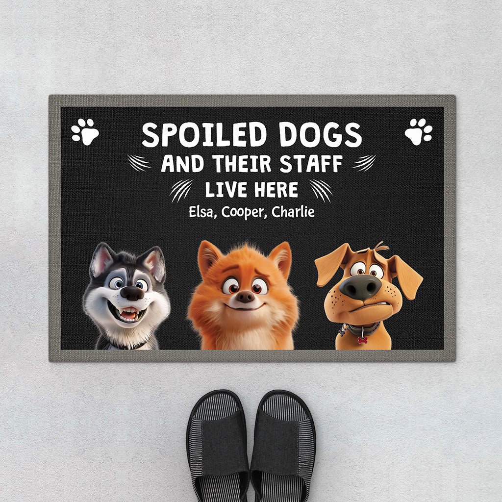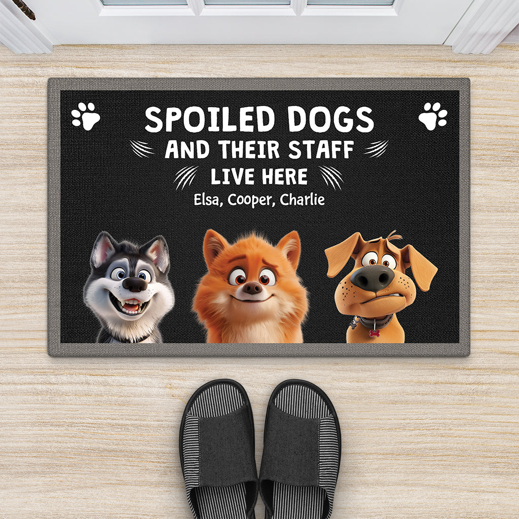 Bring humor to your doorstep with our funny dog doormat custom, announcing to the world that “Spoiled Dogs and Their Staff Live Here.”