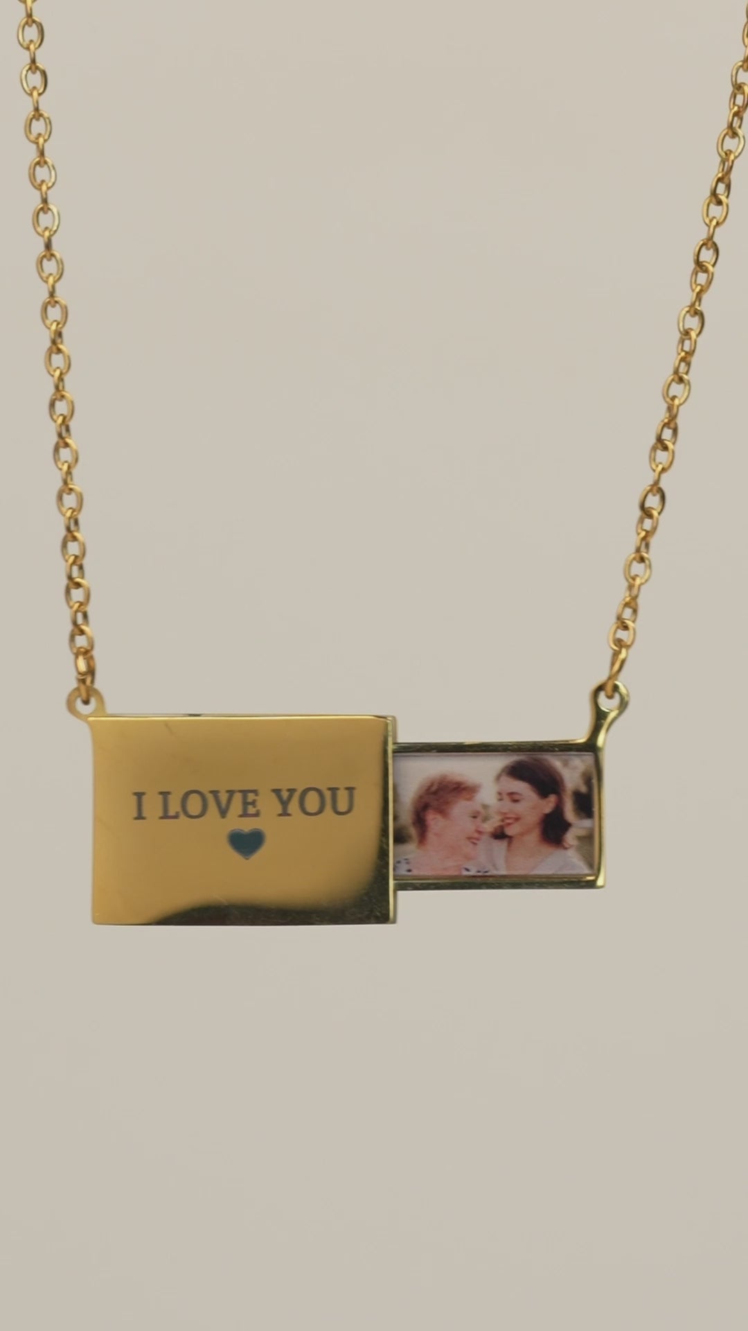 - Envelope Photo Design: This elegant envelope necklace captures heartfelt words and cherished memories in one beautifully crafted piece. The outer plate can be engraved with your personal message, while the hidden photo inside keeps your most precious moment close to your heart — a perfect balance of sentiment and style.