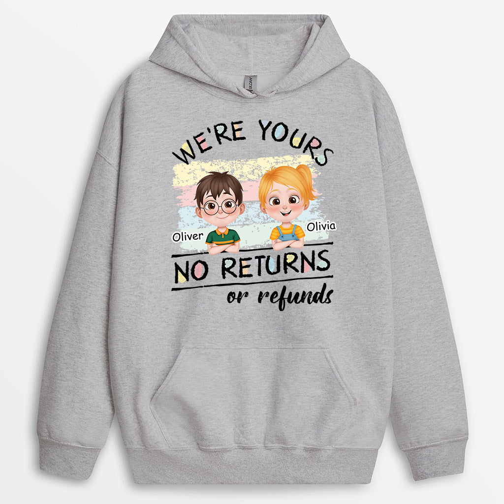 Bring laughter and love together with our personalized hoodie, playfully printed with the quote “We’re Yours – No Returns or Refunds.”