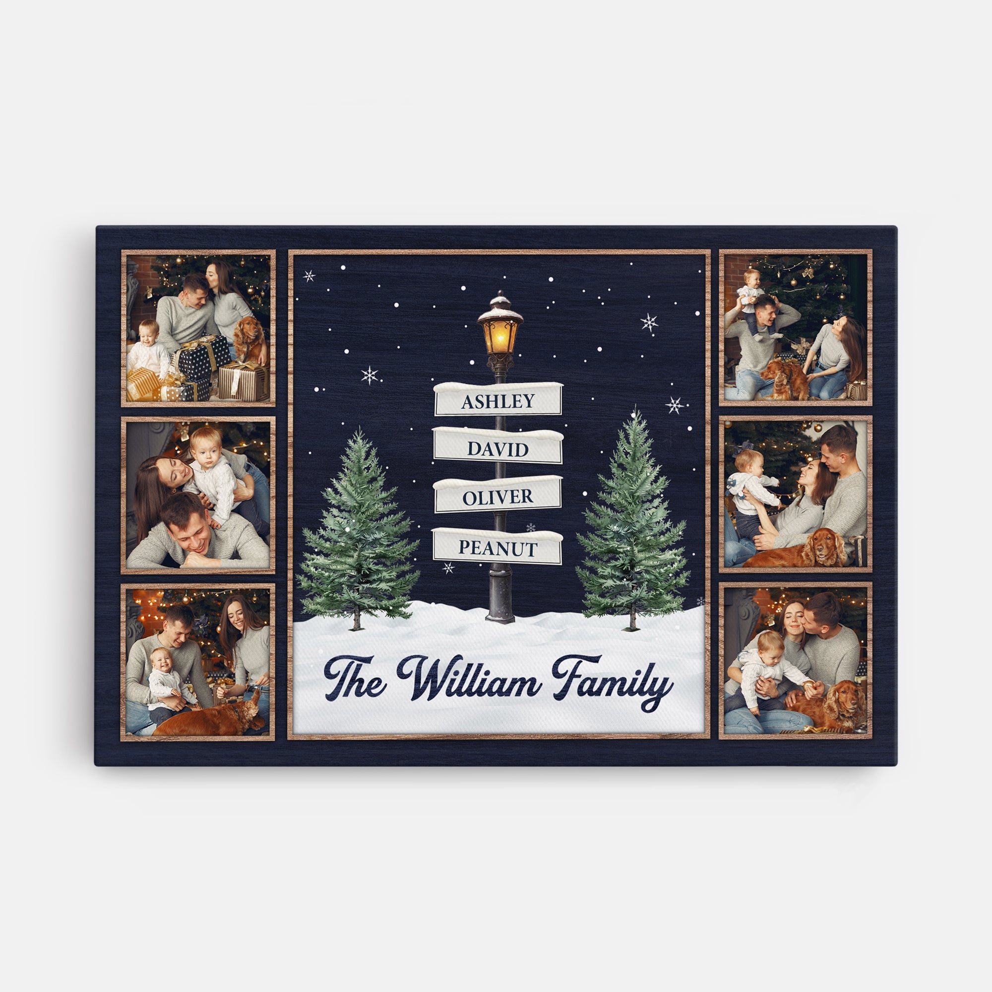 This custom wall décor is designed for families who love displaying meaningful moments at home and makes a wonderful choice for Christmas, housewarmings, anniversaries, or any special celebration. What makes it unique is its personalization—add family names in a charming street-sign layout and upload up to six photos, creating one of the most thoughtful family Christmas gifts you can give. Perfect for parents, grandparents, or anyone who cherishes memories, this Christmas canvas adds warmth to every room.