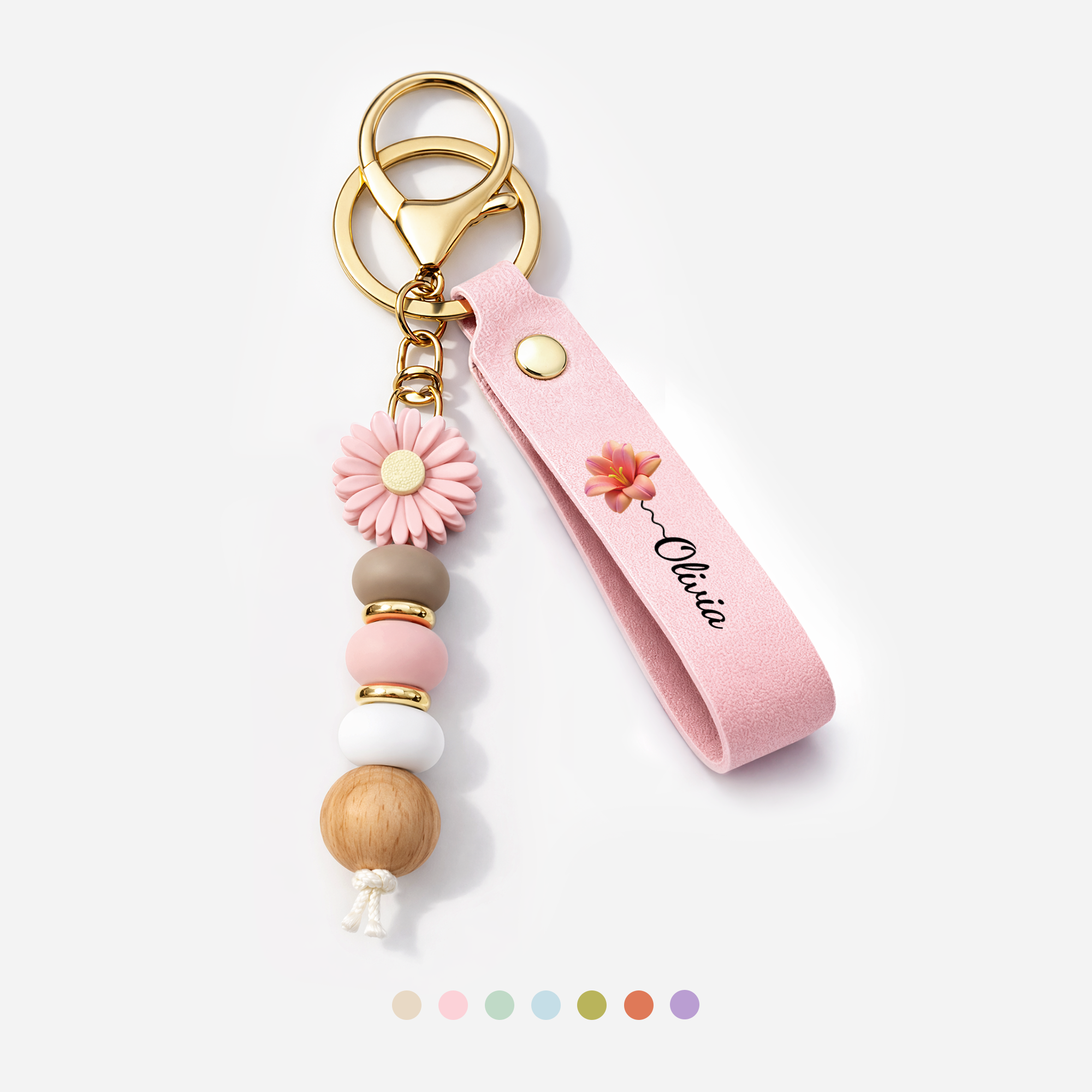 - Personalized Daisy PU Leather Keychain: This elegant keychain features a soft-tone PU leather tag paired with a delicate daisy flower charm and decorative beads. Designed to capture femininity and warmth, it turns a simple everyday accessory into a meaningful keepsake filled with charm and emotion.